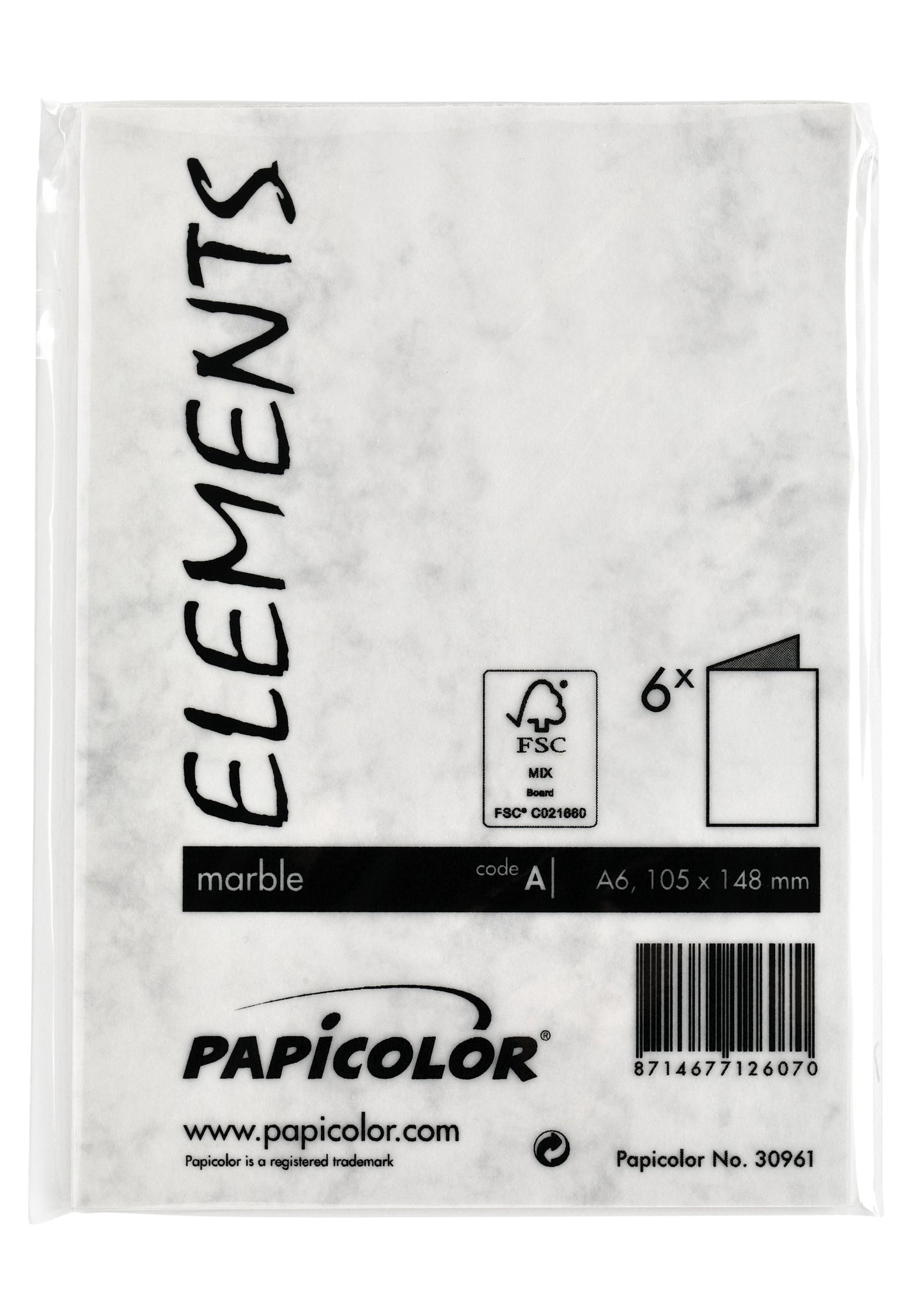 Dubbele A6 kaarten met marmerpatroon in grijs, gevouwen met afmeting 105x148 mm. Gemaakt van 210 g/m² papier. Verpakt per 6 stuks. Geschikt voor hobby en creatieve doeleinden. Past bij marmergrijze enveloppen en A4 papier.