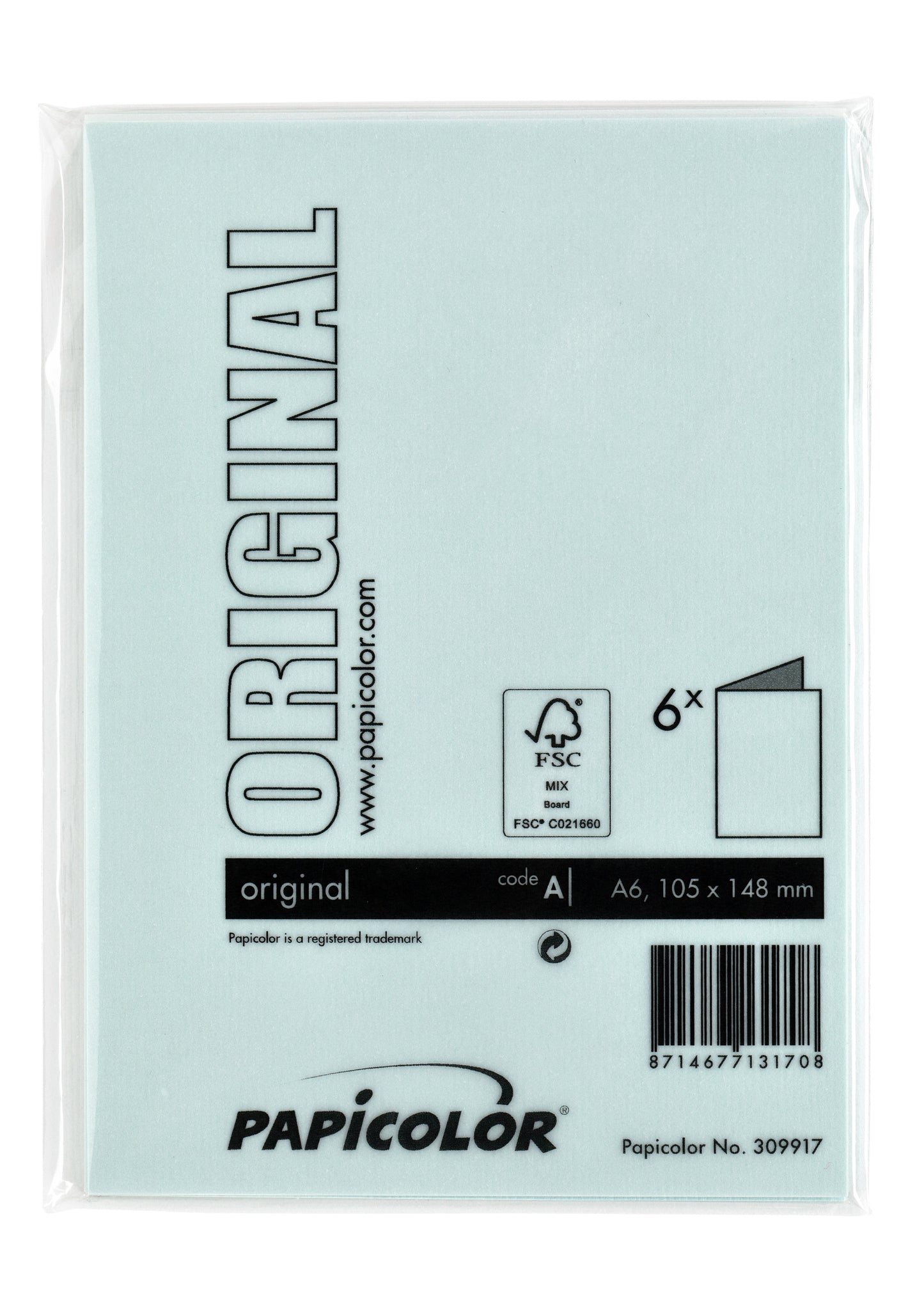 Dubbele A6 kaarten in zeegroen, gevouwen met afmeting 105x148 mm. Gemaakt van 210 g/m² papier. Verpakt per 6 stuks. Geschikt voor hobby en creatieve projecten. In dezelfde kleuren beschikbaar met enveloppen en A4 papier.