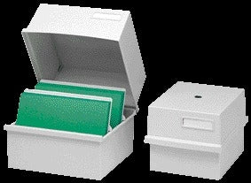 Kleine kaartenbak met afneembaar deksel, geschikt voor ongeveer 500 A6-kaarten. Voorzien van grijprand, indicatievenster en scheidingsmogelijkheden. Afmetingen: 165x128x96mm.