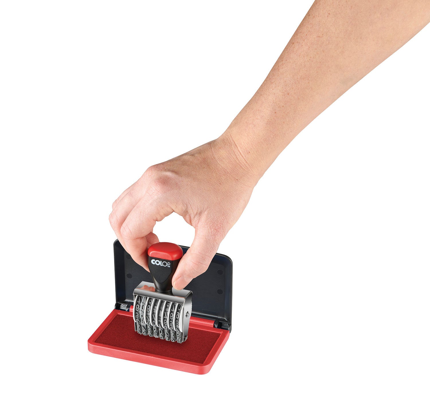 Stempeldoos gevuld met kantoorinkt voor microstempels, in de kleur rood. Documentechte inkt volgens ISO-14145-2, kunststof behuizing.