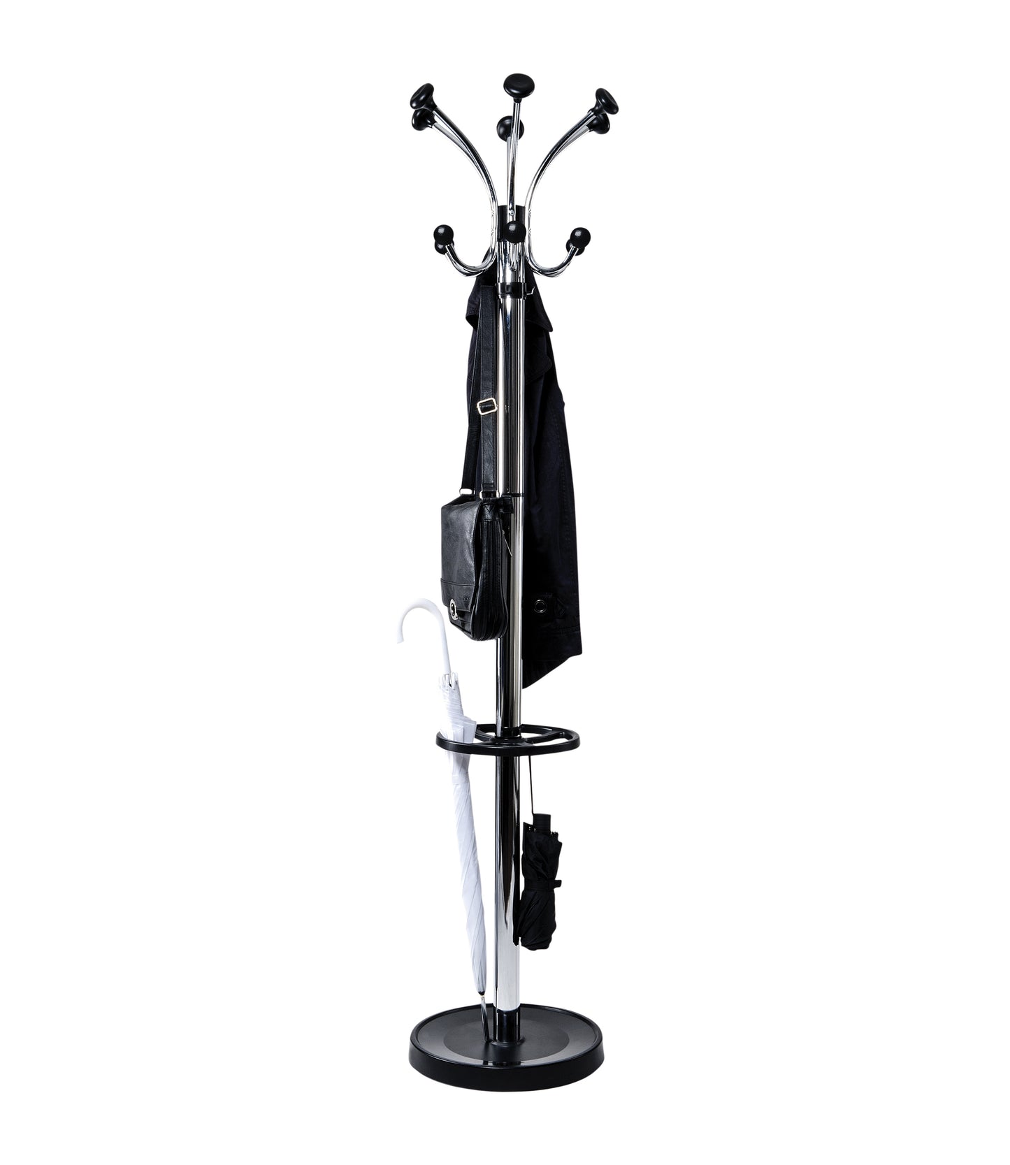 Elegante, glanzende kapstok van staal met metallic afwerking en 8 drievoudige haken van recyclebaar aluminium. Inclusief parapluhouder voor 8 paraplu’s en 4 zakparaplu’s. Draaibare kroon van 41 cm voor goede bereikbaarheid. Hoogte: 176 cm, voetdiameter: 36,5 cm, gewicht: 6 kg. Eenvoudige montage en demontage.