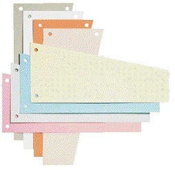 Gekleurde scheidingsstrook voor het onderverdelen van documenten met een trapeziumvorm. Afmetingen 240x105/55mm, vervaardigd uit 190g gerecycled manillakarton. Voorzien van dubbele perforatie en Blauwe Engel keurmerk.