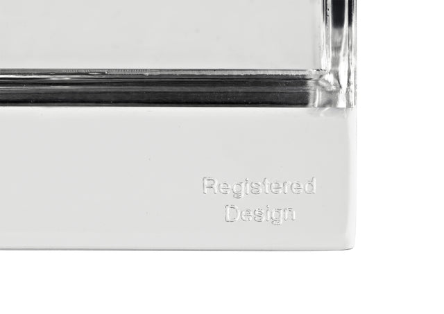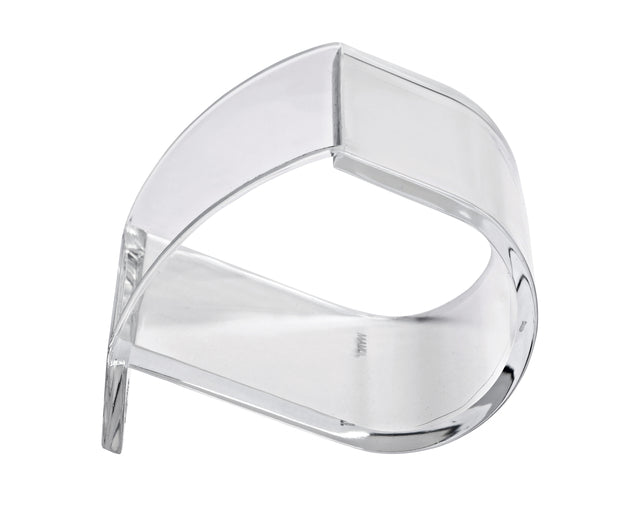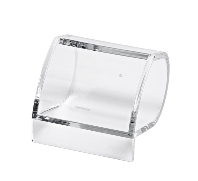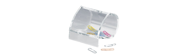Transparante acryl papercliphouder met afgeronde achterzijde voor gemakkelijke toegang. Elegant ontwerp en geschikt voor diverse kantoorruimtes.