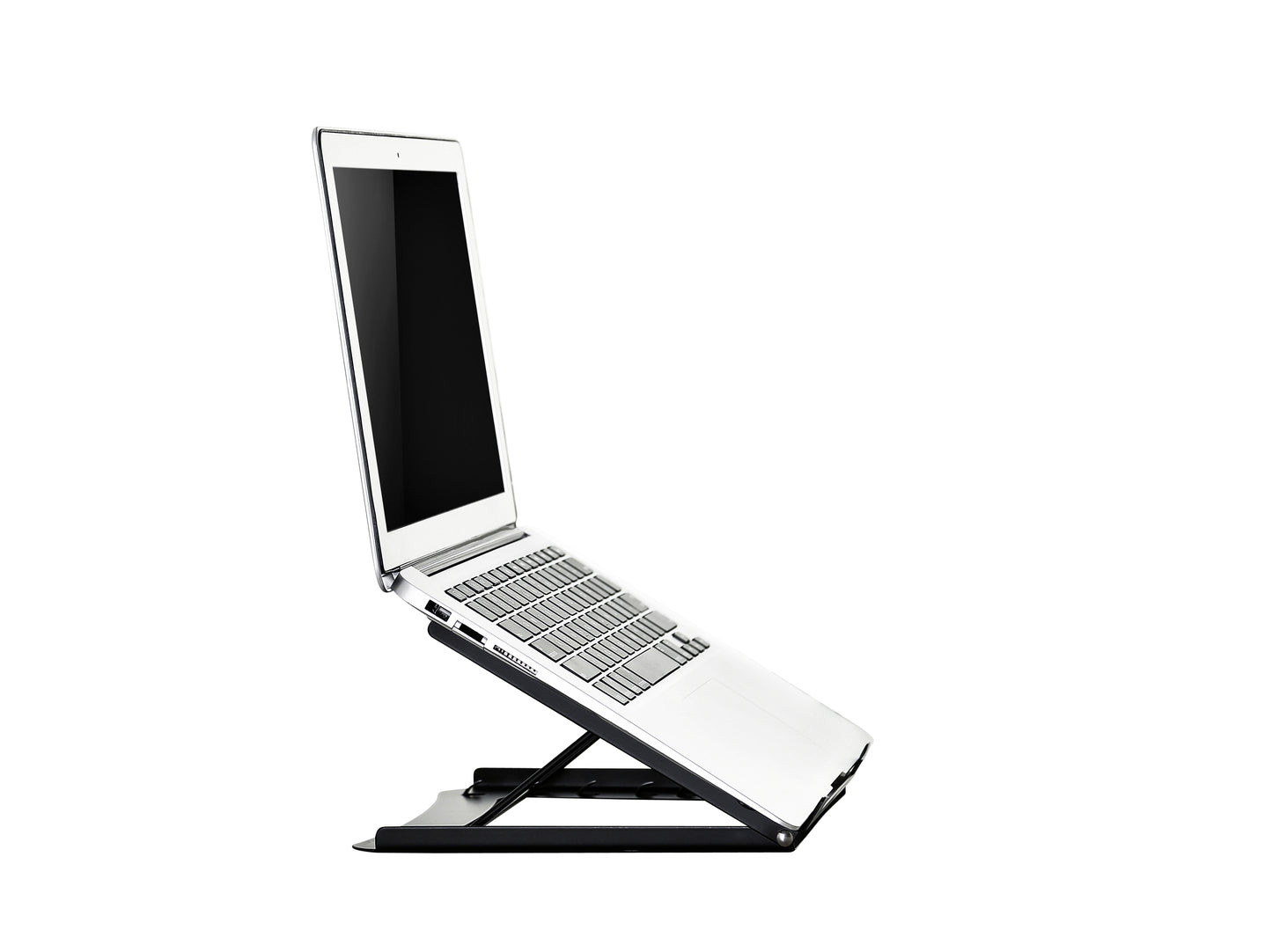 Deze universele laptopstandaard plaatst uw notebook ergonomisch in vijf verstelbare standen. Lichtgewicht en eenvoudig in te klappen voor mobiel gebruik. Gemaakt van staal met poedercoat afwerking en voorzien van siliconen anti-slip pads, die warmteafvoer bevorderen en oververhitting voorkomen, wat zorgt voor betrouwbare prestaties.